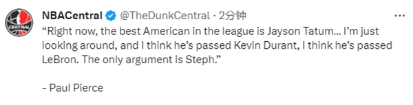 谈到目前谁是联盟中最好的美国球员,皮尔斯表示:现在,联盟中最好的美国球员是杰森-塔图姆,你可以看到他在过去几年的成长,全明星赛55分,季后赛对阵费城时抢七轰下50分,我只是环顾四周,我认为他超越了凯文-杜兰特,我认为他的超越了勒布朗(詹姆斯)。唯一的争论可能是斯蒂芬(库里)。