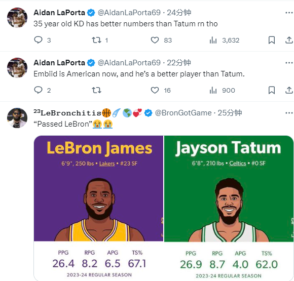 76人球迷表示35岁杜兰特比塔图姆更好,恩比德现在才是美国最好的球员;詹姆斯球迷也不满了,晒出两人本赛季的数据——詹姆斯场均26.2分8.2篮板6.5助攻,真实命中率67.1%,塔图姆场均26.9分8.7篮板4助攻,真实命中率62%。