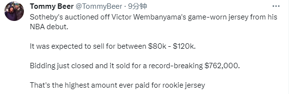 文班亚马在NBA首秀所穿的马刺1号球衣已经成功拍卖,本来预计售价8万-12万美元之间,随着拍卖结束,最终以破纪录的76.2万美元成交,这是有史以来新秀球衣的最高拍卖金额。