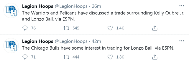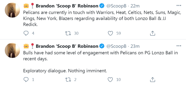 鹈鹕高层不愁没人报价。罗宾逊报道称,10支球队加入了鹈鹕双星的争抢。他表示,鹈鹕已经和勇士、热火、凯尔特人、篮网、太阳、魔术、国王、尼克斯、开拓者讨论过和球哥、雷迪克相关的交易。公牛近日也加入关于球哥的交易讨论,但他们暂时处于探索阶段,交易不会很快发生。