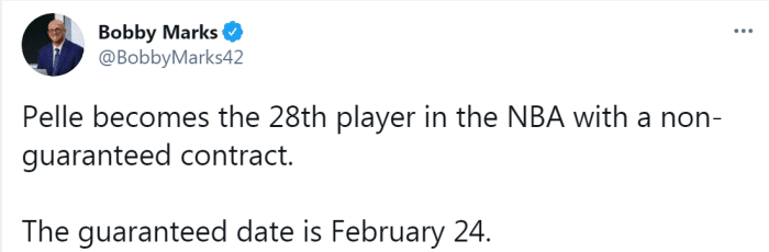 薪金专家鲍比-马克斯表示,佩莱成为NBA目前第28位签约非保障合同的球员,合同转为保障的日期是2月24日。只要佩莱留在篮网的名单上,他每一天的薪水是9902美元。