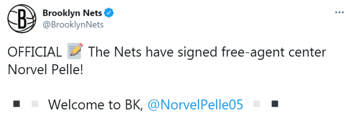 来源:JRS直播网01-29 20:23JRS直播网讯 北京时间1月29日,布鲁克林篮网官方宣布,球队和自由球员诺威尔-佩莱完成签约。一周前,双方就有签约意向,但根据联盟的健康与安全协议,佩莱必须先通过规定的检测和隔离期,如今,他已经符合这一标准。