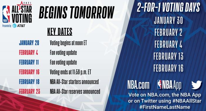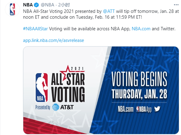 NBA全明星首发阵容由球迷、媒体和球员三方共同投票,其中球迷投票占比50%,球员和媒体投票各占25%;NBA官方将在2月5日、2月12日公布球迷投票的实时投票结果。