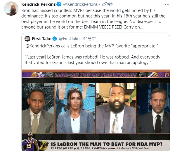 退役后成为名嘴的帕金斯回应詹姆斯是NBA本赛季MVP(最有价值球员)?他表示:(去年)勒布朗-詹姆斯被抢劫了!他被抢劫了。所有去年投票支持扬尼斯(字母哥)的人都应该向他道歉。