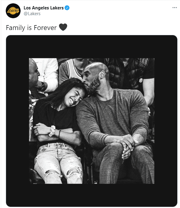 湖人官方晒出科比生前坐在斯台普斯球馆场边,亲吻Gigi的甜蜜时刻,并且写道:家是永恒的。
