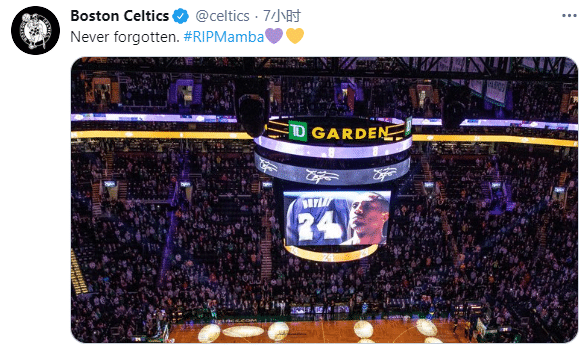 凯尔特人晒出此前在TD北岸花园球馆致敬科比的画面,当时现场坐满球迷,集体缅怀科比;并且写道:永不忘记!#安息吧!黑曼巴