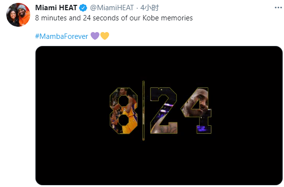 热火官推把头像换成科比和Gigi的合影,连续更新多条动态向科比致敬,其中有一条是用8分24秒的视频纪念科比,热火如此操作太用心了。