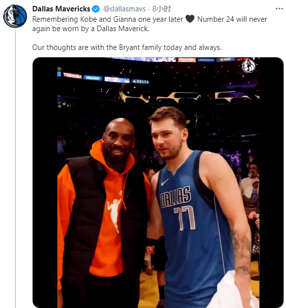 独行侠官方晒出科比和东契奇寒暄以及合影的暖心画面,并且正式宣布:一年后缅怀科比和Gigi,达拉斯独行侠的24号球衣将永远不会再被球员使用,从今直到永远,我们的思念与布莱恩特家族同在。