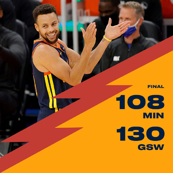 末节,戴维斯暴扣得手,帮助森林狼将分差缩小至个位数,随后乌布雷便回应一记三分。此后,两队再度陷入胶着,分差始终保持在10分左右。比斯利不断砍分,帮助森林狼队追分,在完成一次反击暴扣后,将分差缩小至8分,打停勇士队。暂停回来后,库里直接飙中三分,帮助勇士队止血。随后库里连续砍分接管比赛,直接将分差扩大至14分,打停森林狼队。而后,库里再中超远三分,将分差扩大至18分。最终,勇士队以130-108战胜森林狼队。