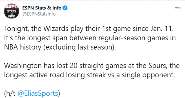来自ESPN的统计,本场比赛之前奇才在马刺主场已经遭遇了疯狂的20连败,是现存最长的面对同一对手客场连败纪录。而本场比赛的输球,让奇才对阵马刺的客场连败数字提升到了21场,上一次奇才客场击败马刺,还是在遥远的1999年12月。