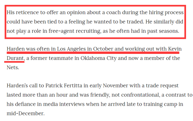 哈登在去年10月经常去洛杉矶,和此前雷霆的队友凯文杜兰特一起训练。随后在11月初,哈登在和老板费尔塔蒂的通话过程中,友好地提出了交易申请。但直到1月份连续第二次输给湖人之前,哈登对于现状更多的是思考,而不是沮丧。