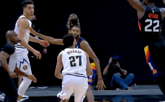 这场比赛裁判吹罚出现了严重漏判,第四节的比赛最后一攻,太阳队当时领先掘金队3分,他们有很大的可能去赢下比赛,只要防好掘金队的三分投射即可,掘金队最后一攻,穆雷接到约基奇手递手传球,穆雷撤到了三分线外超高难度的三分投射命中,这才有了后来的比赛进入加时,掘金逆转取胜。