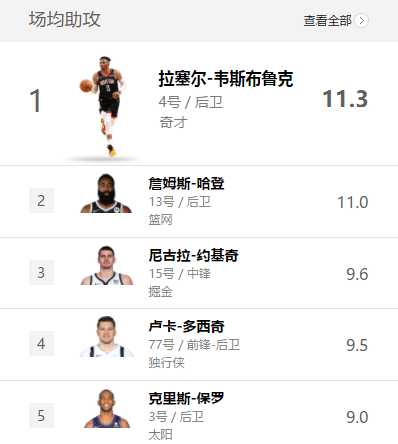 拥有杜兰特、欧文和哈登的篮网毫无疑问会成为球迷们关注的焦点,这三人的个人能力也都很强,他们除了要带队取得好成绩之外,还得力争在各个榜单中角逐荣誉,这其中来到篮网之后得分势头放缓,但助攻增加的哈登有点像上个赛季的詹姆斯,截止到目前,哈登的场均助攻是11.0个,位居助攻榜第二名,落后前队友韦少,但联想到韦少打得比赛不多,所以哈登的数据更有代表性。