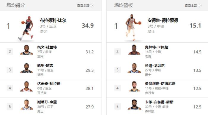 得分层面场均得分第一的是比尔,他场均可以拿下35.9分,后面两人就是篮网的711组合了, 杜兰特场均拿下36.3分,欧文场均可以得到34.6分,值得一提的是杜兰特在最近7场比赛中有6场可以得到30+的分数,而欧文回归之后前两战拿下37和38分,今天击败热火也是得到了28分,势头不减。按照目前篮网的结构,杜兰特和欧文是负责得分的重锤,所以他们很有希望冲击得分王。