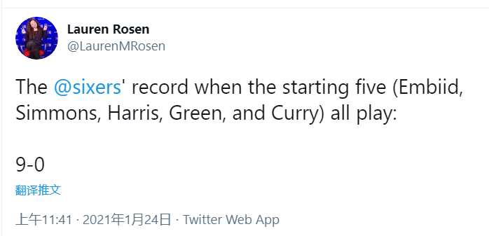 来源:JRS直播网01-24 19:33JRS直播网1月24日讯 NBA常规赛,费城114-110击败活塞,拿下3连胜继续排名东部第一,并且将与第二名的差距拉开到两个胜场。赛后,费城当地记者做出统计。本赛季,当费城先发五虎全部登场打球时,球队的战绩是疯狂的9胜0负。在里弗斯手下,费城本赛季非常有机会去创造佳绩。