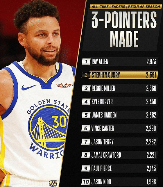 值得一提的是在前段时间库里接受连线采访的时候,记者就是雷吉-米勒,当时雷吉-米勒还提起了库里马上就要超越自己的话题,库里也表示需要雷吉-米勒在那里等着自己,很快就会追上了。如今库里实现了,他完成了对于这位传奇射手的超越,升至NBA三分球历史总数第二名,第一名是雷-阿伦的2973记,库里仍有差距。