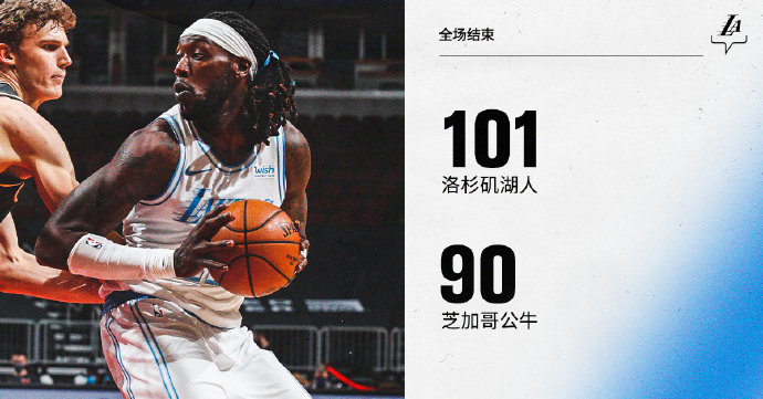 末节,公牛的进攻再次陷入低迷,而湖人的马修斯上来之后连续获得分数帮助球队一波6-0的小高潮再次将分差扩大到二十分以上,在比赛要就此失去悬念时多诺万及时喊停,但比赛的局势还是没能得到扭转,湖人一直保持着场上的大比分领先优势,公牛追分无望比赛也进入了垃圾时间。最终湖人101-90战胜公牛。