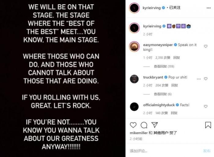 获杜兰特力挺!欧文深夜发文:准备谈论我们的伟大吧,不愿意的随便你!