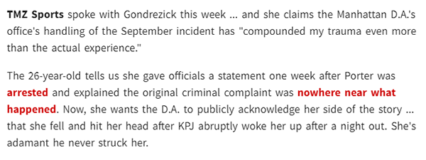 近日小波特女友Kysre Gondrezick接受采访时,Kysre表示尽管她一再否认小波特袭击了她,但地方检察官仍在推动“虚假陈述”,并声称检察官的处理方式“比实际经历更加深了我的创伤”。