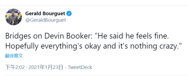 本场最后时刻, 布克没有出现在赛场上。赛后,主帅蒙蒂威廉姆斯表示布克腿筋受伤,不大可能出席背靠背对阵掘金的比赛。不过赛后队友布里奇斯接受采访时表示,布克说他感觉很好。布克的腿筋一直是他的老伤。18-19赛季,布克就曾左腿腿筋受伤,当时一度连续缺席7场比赛。