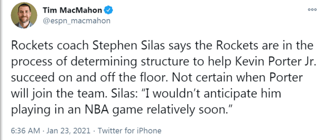 火箭第10套首发出炉!主帅透露沃尔伍德回归时间,小波特现状曝光