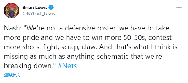 篮网输球赛后,纳什表示:我们不是一个防守型球队,我们必须更加拼命,我们必须赢得更多五五分的比赛,比赛中需要更多的投篮,战斗,拼抢,抢球;我认为这就是我们球队所缺少的东西。