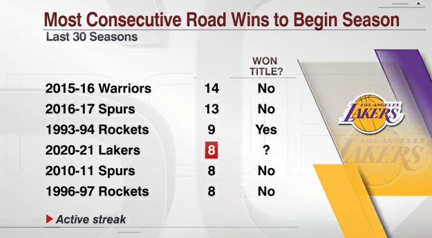 来源:JRS直播网01-23 14:45JRS直播网1月23日讯 近日湖人开启了连续7个东部客场之旅,他们在第一场就击败了强大的雄鹿,这样湖人本赛季开局客场8战全胜,创造了队史的新纪录。不少球迷觉得这个赛季的湖人真的是不可阻挡,客场都可以连续取胜,卫冕的希望更大了。但很快有数据统计出炉,最近30年来,开局客场8连胜甚至更高的球队中,只有1队夺冠了,联想到能够做到如此壮举的必定是豪强和夺冠热门,这样的概率就确实太低了。