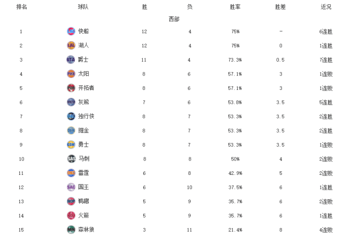 西部1-8名:湖人、爵士、快船、太阳、开拓者、灰熊、独行侠、掘金;