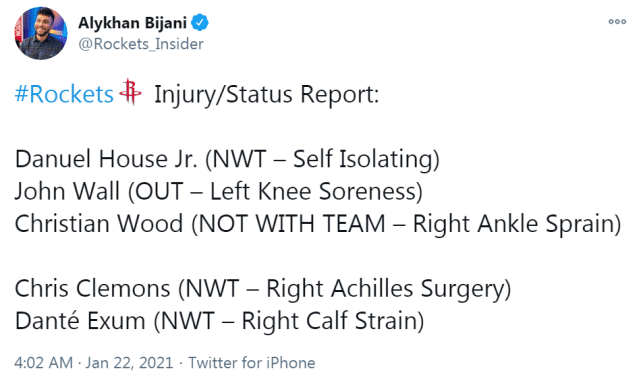 火箭公布最新伤情!5人上榜伍德踝伤已离队,考辛斯再次进入首发