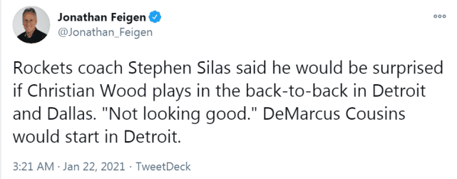 《休斯顿纪事报》名记费根在社媒上写道:“火箭主教练赛拉斯说如果伍德能在对活塞和独行侠的背靠背比赛中上场,他会感到惊讶。‘看上去不太妙’,考辛斯将在对活塞的比赛中打首发。”