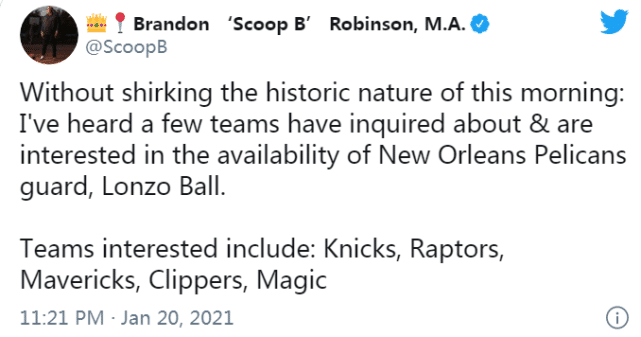 来源:JRS直播网01-21 15:32JRS直播网讯 北京时间1月21日,据NBA记者布兰登-罗宾逊报道,新奥尔良鹈鹕的控卫朗佐-波尔(球哥)引起了不少球队的兴趣,尼克斯、猛龙、独行侠、快船和魔术都已联系鹈鹕,询价球哥,探讨交易他的可能。
