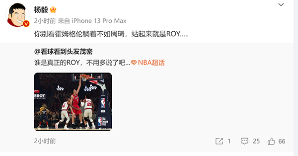这场比赛结束之后,杨毅在社交媒体上点评比赛,盛赞霍姆格伦的同时还不忘改口:你别看霍姆格伦躺着不如周琦,站起来就是ROY(年度最佳新秀)。