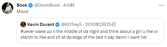 不过值得一提的是,在杜兰特转发昔日推文之前,布克已经转发了该动态,并且配文写道:现在的心情。