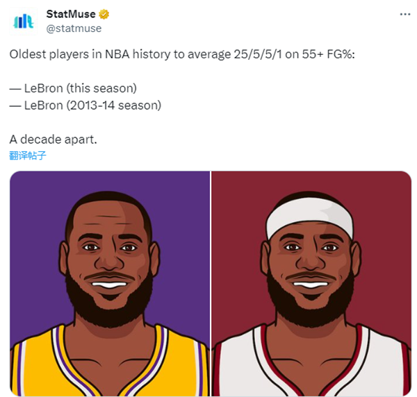 今日美媒Statmuse晒出联盟历史上单赛季场均25分5篮板5助攻1抢断55%命中率的最老球员排名,即将39岁的詹姆斯(本赛季)刷新了自己在2013-14赛季创造的最老纪录。