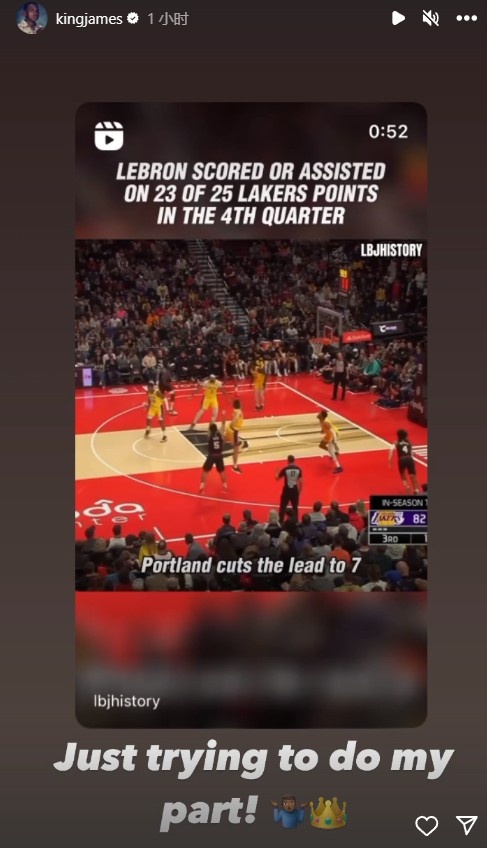 在击败开拓者的比赛中,詹姆斯末节拿到7分7次助攻,通过自己得分和助攻,一个人贡献了湖人全队末节25分中的23分,另外2分是雷迪什拿到的;詹姆斯转发自己单节独造23分的数据,配文写道:我只是尽力做好自己的部分。