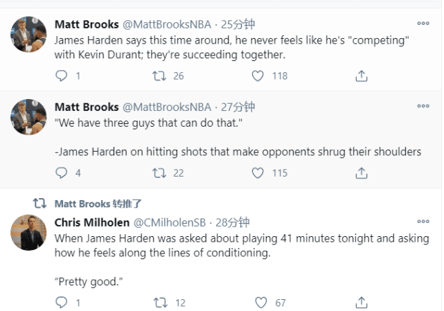 此外,哈登也表示,这支队伍里有3名可以在关键时刻让对手无可奈何的队员。最后,哈登还谈到了科比,表示:“我非常想念他。”主帅史蒂夫纳什也称赞了球队的表现,同时纳什表示自己对于欧文回归非常期待。