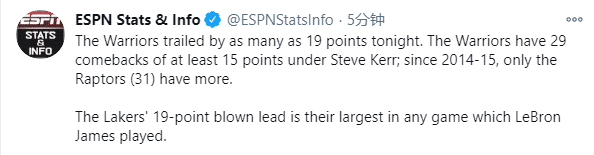 据统计湖人惨遭19分大逆转是詹姆斯湖人生涯所打比赛中被逆转的最大分差,也就是詹姆斯湖人生涯最扎心一战;勇士19分逆转湖人是科尔执教勇士以来的第29场至少15分大逆转,14-15赛季以来仅有猛龙31次比同期的勇士多。