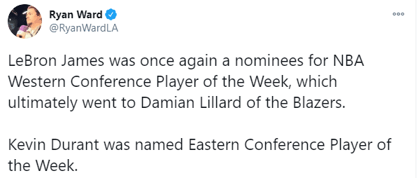 场均34+8+5!杜兰特当选周最佳,两项命中率太恐怖,詹皇获提名落选