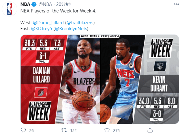 来源:JRS直播网01-19 10:51JRS直播网讯 北京时间1月19日,NBA官方公布常规赛第四周东西部周最佳球员,篮网巨星杜兰特和开拓者核心利拉德分别当选,两人都是场均狂砍30+5+5的数据,其中“死神”杜兰特的状态更加恐怖。