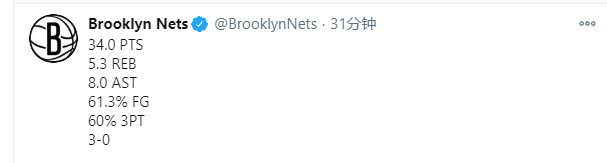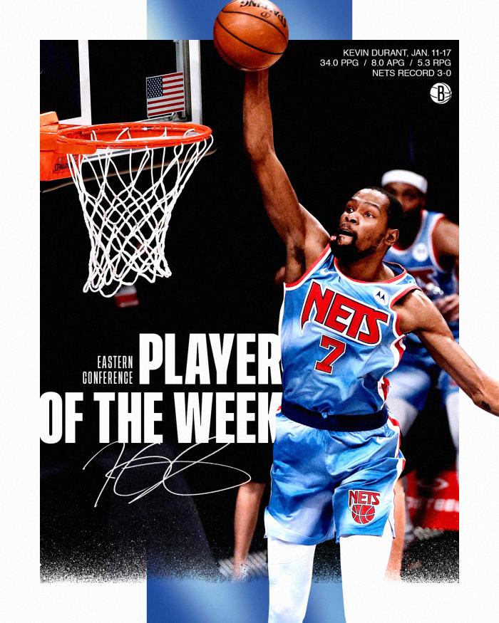 篮网官方晒照庆祝杜兰特当选东部周最佳,并且晒出杜兰特的恐怖数据。