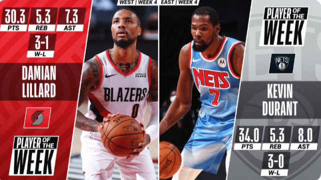 官方公布上周最佳球员!杜兰特利拉德当选,东契奇场均30+三双无缘