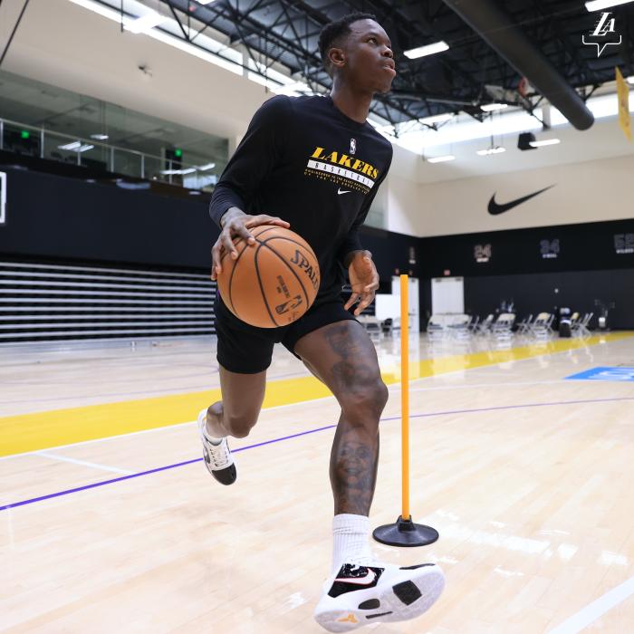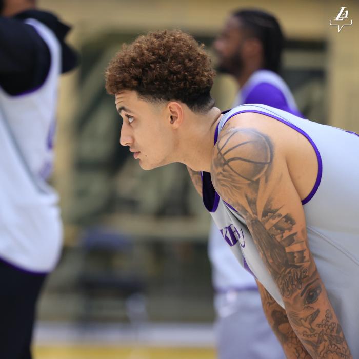 36岁詹姆斯又是身穿湖人6号紫色战袍,搭配一件白色短裤参加训练,训练中嬉皮笑脸,咧嘴大笑满脸笑容,心情特别好;库兹马双手扶着膝盖,眼神坚定十分专注是,训练中库兹马伸开手臂积极防守浓眉,从所穿球衣颜色来看,詹姆斯和浓眉带着一队,另外一队成员包括库兹马、大莫里斯等球员;不过浓眉没穿3号,应该是临时换上了波普的1号。
