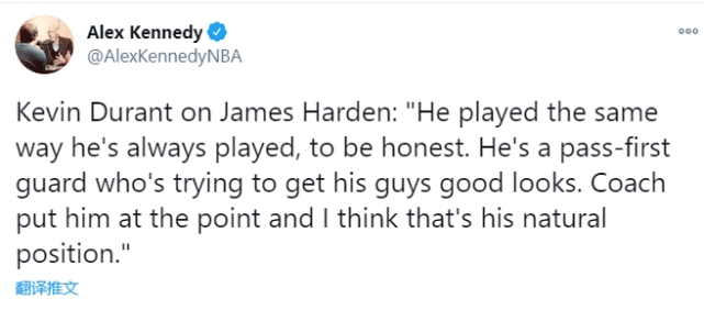 杜兰特赛后称赞哈登:“难以置信!你可以看到他早早就在试图找到最佳的比赛方式,之后就进入了自己的模式之中,打出了侵略性,努力去得分,让我们其他人更容易。”不过在谈到哈登的打法时,杜兰特表示“他一直是这么打的,没有任何改变。他是传球优先的后卫,教练让他打控卫,我也认为这才是他原本该打的位置。”
