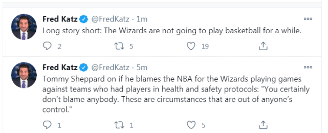 奇才跟队记者Fred Katz在社媒上更新这些信息后,也写了一句:“长话短说,奇才将有一段时间不能打比赛了。”