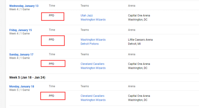 NBA官宣推迟的多场比赛里,就有不少和奇才相关。从北京时间1月14日开始,奇才对爵士、奇才对活塞、奇才两场对骑士的比赛已经全部正式延期。如果他们的状况没有改善,预计更多奇才相关的比赛被延期。