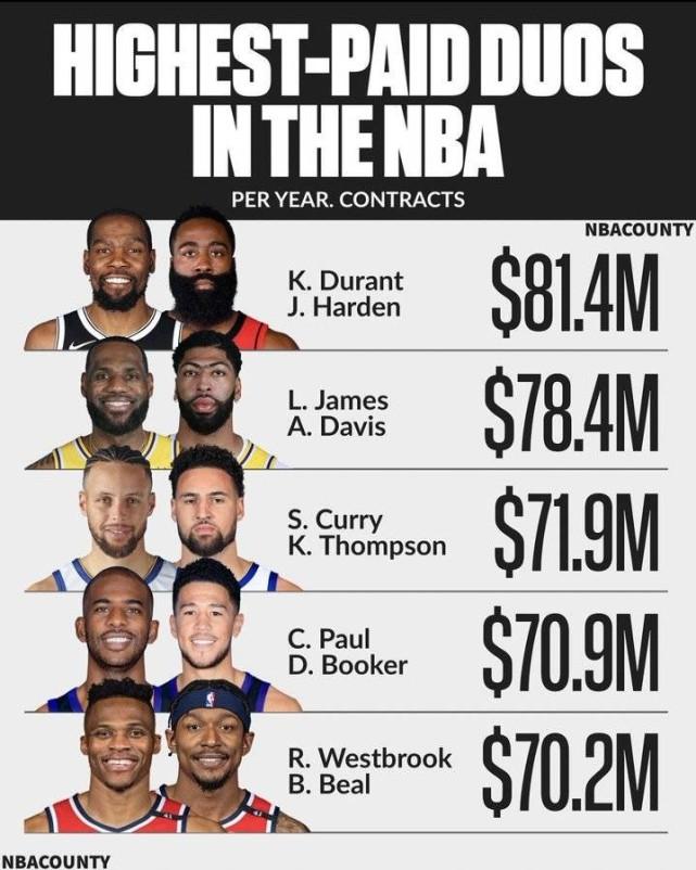 也有美国媒体统计,NBA目前二人组的薪资排名,从图中可以看到,杜兰特&哈登的薪资总和为8140万美元,高居榜首。紧接着的是湖人队双星詹姆斯&戴维斯,二人本赛季的薪资总和为7840万,随后是库里&克莱汤普森的7190万,保罗&布克的7090万、韦少&比尔的7020万。