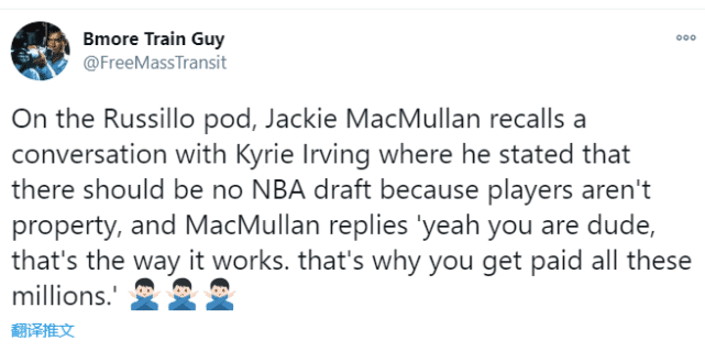 Macmullan说了他与欧文之间在2年前的一次谈话。欧文当时对记者说:“NBA不该有选秀大会,球员们应该可以想去哪里就去那里,我们并不是某些人的财产。”这位记者当时就反驳欧文,球员就是老板的资产,联盟就按照这个规则运转的,这也是你们能拿到千万年薪的原因。记者随后表示,因此他相信欧文是被场外的社会事件影响了,欧文可能认为,那些事情才是最重要的。