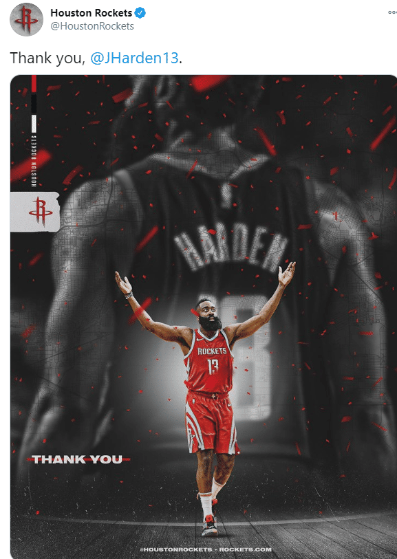 来源:JRS直播网01-15 09:46JRS直播网1月15日讯 火箭和篮网都已官宣关于哈登的大交易正式完成,篮网官方欢迎哈登来到布鲁克林,正式成为篮网队的一员;火箭则是晒照并写道:谢谢你,哈登!
