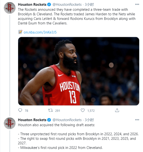 火箭已经官宣完成交易,把哈登交易到篮网,得到勒维尔、库鲁茨、艾克萨姆和4个首轮选秀权、4个首轮互换权,这是一笔1换11的超级大交易;随后火箭官方正式和哈登说再见:谢谢你,哈登。