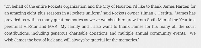 火箭老板费尔蒂塔也发表声明:我代表整个火箭队和休斯顿市,感谢詹姆斯-哈登穿着火箭球队打出了令人惊叹的八个多赛季,他为我们带来了太多美好的回忆,我们见证了他从年度第六人成长为全明星和MVP;詹姆斯-哈登,祝你好运,并将永远感激那些回忆!
